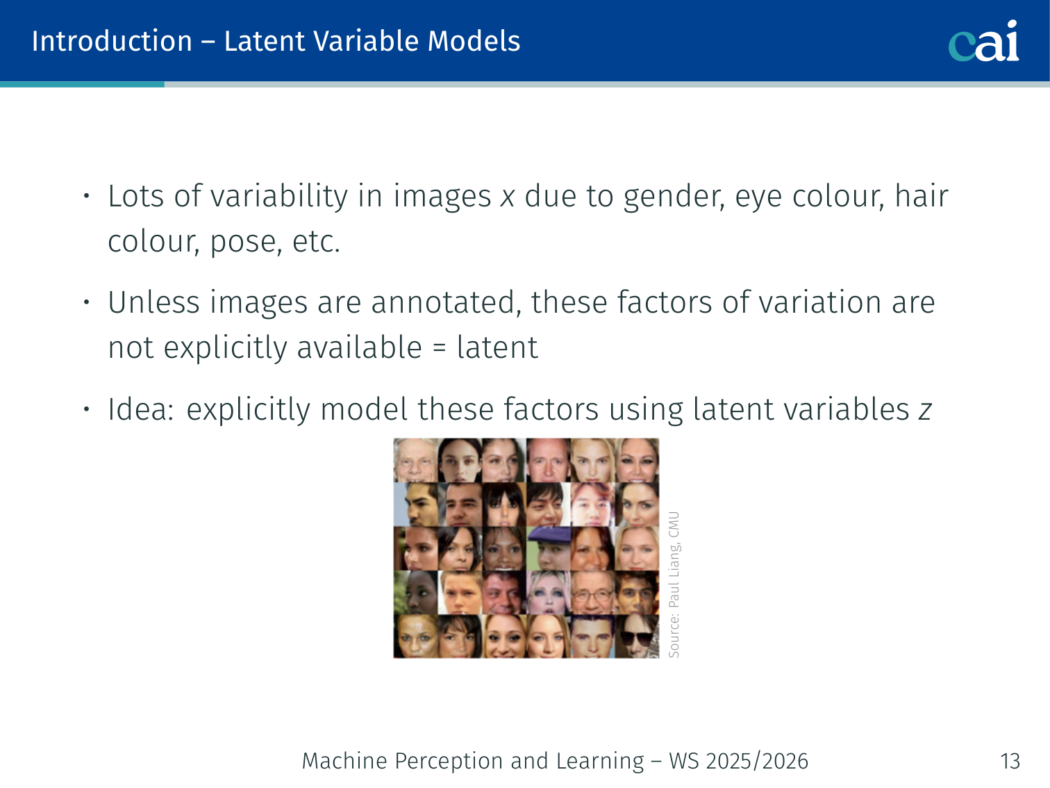 Images have huge variability: gender, eye colour, hair colour, pose, lighting, etc. Unless annotated, these factors of variation are not explicitly available — they are latent.
