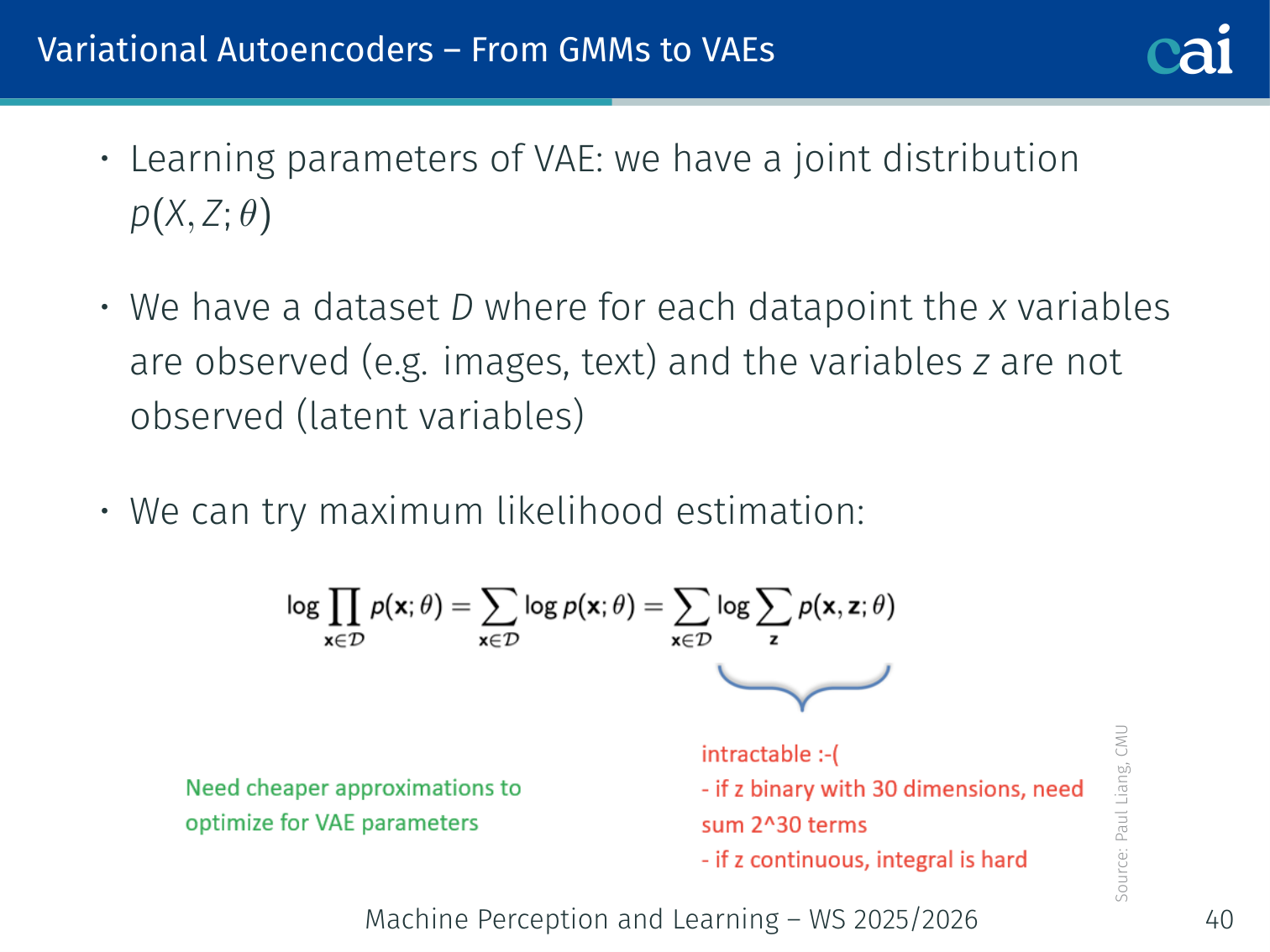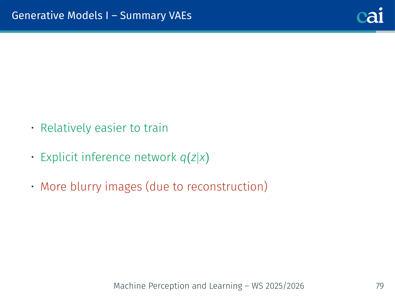 | Cons | Blurry samples (MSE averages over uncertainty); ELBO is a lower bound (no exact likelihood) |