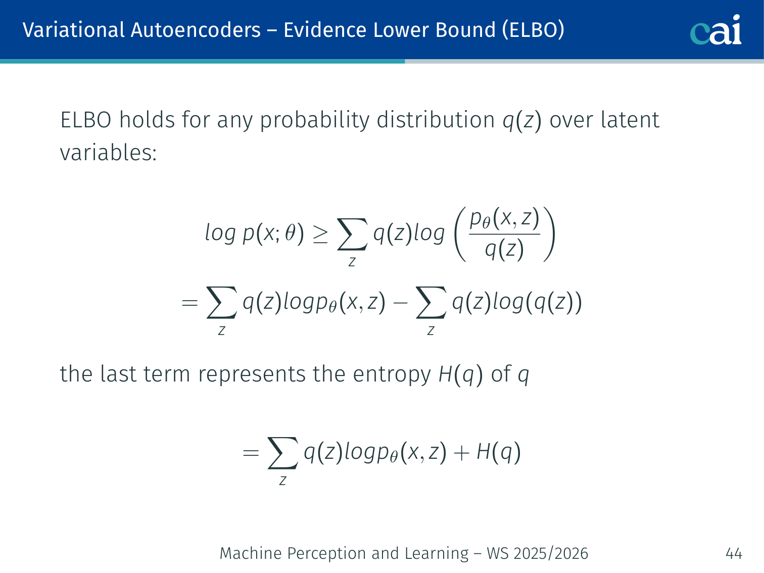 - ELBO: The Evidence Lower Bound is the training objective that balances reconstruction quality with latent space regularity.