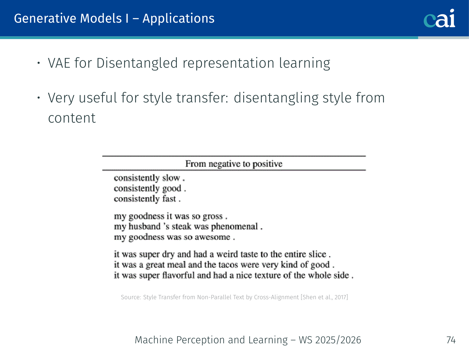 - Text style transfer: encode a sentence, manipulate the style dimension (e.g. sentiment), decode back. [Shen et al., 2017]