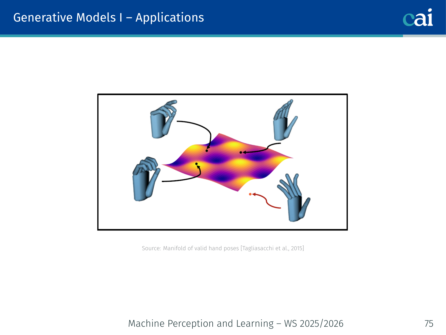A VAE trained on hand pose data learns a smooth, compact manifold of valid hand configurations. Sampling from the manifold always produces a valid (anatomically plausible) hand pose — useful for 3D pose estimation from noisy depth sensors.