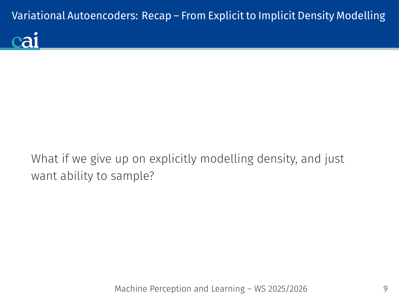 This motivates implicit density models — we don’t write down at all. We only care about samples.