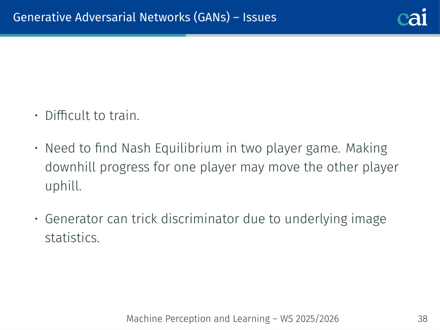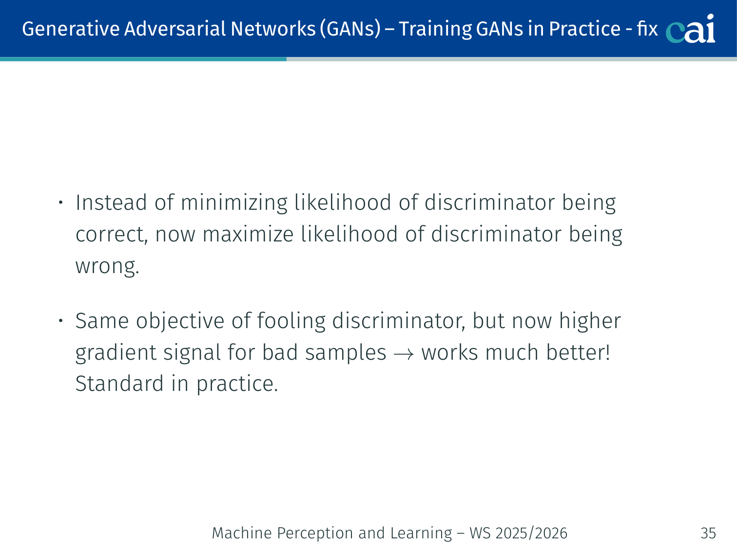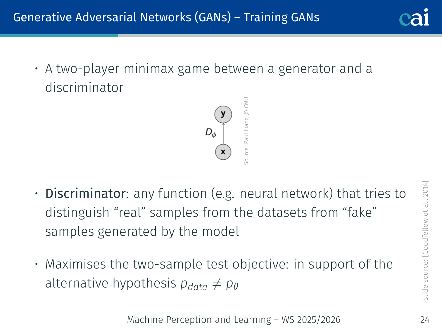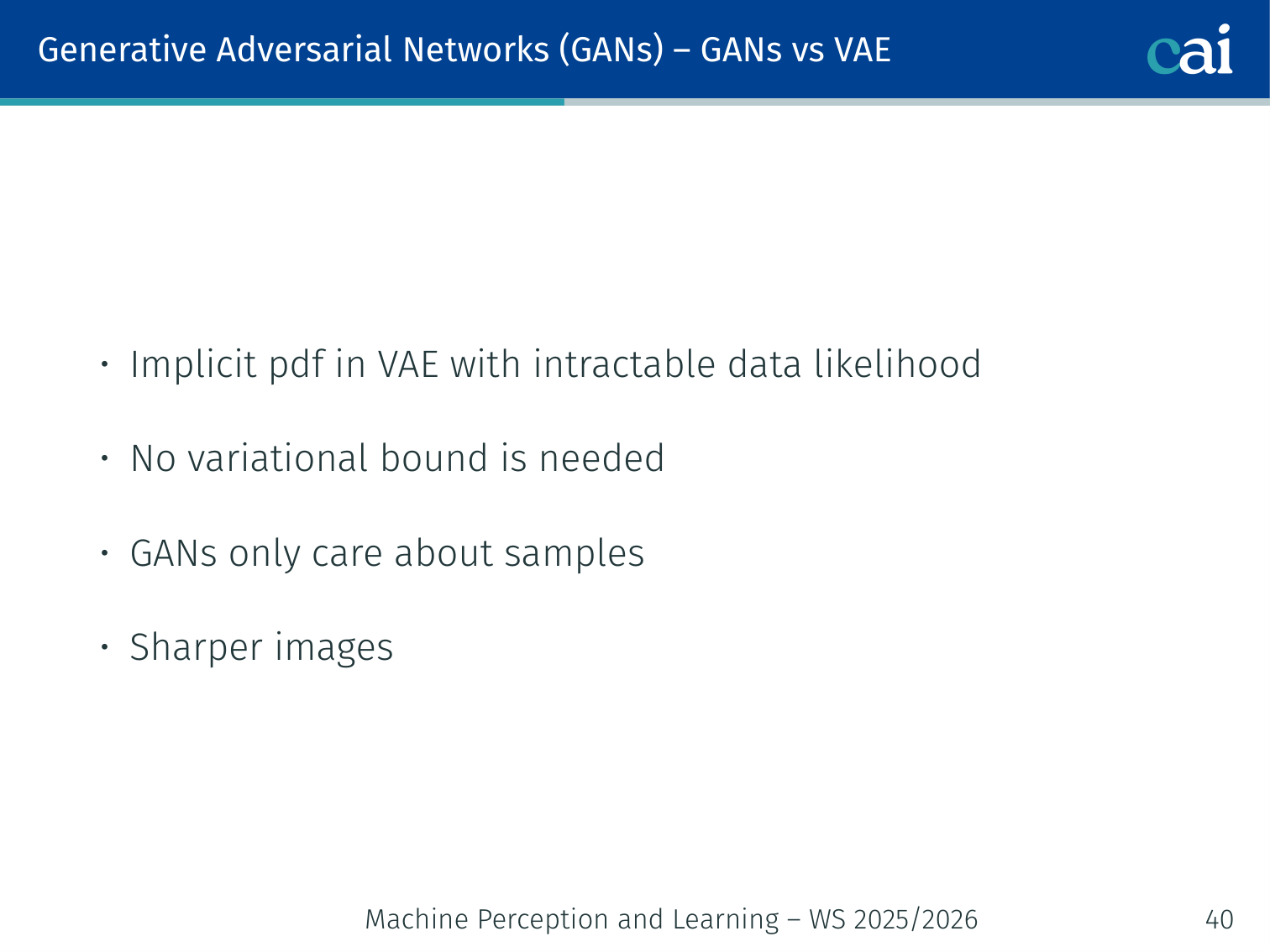 - The discriminator acts like a learned training signal for realism, which is why GANs can produce very sharp samples.