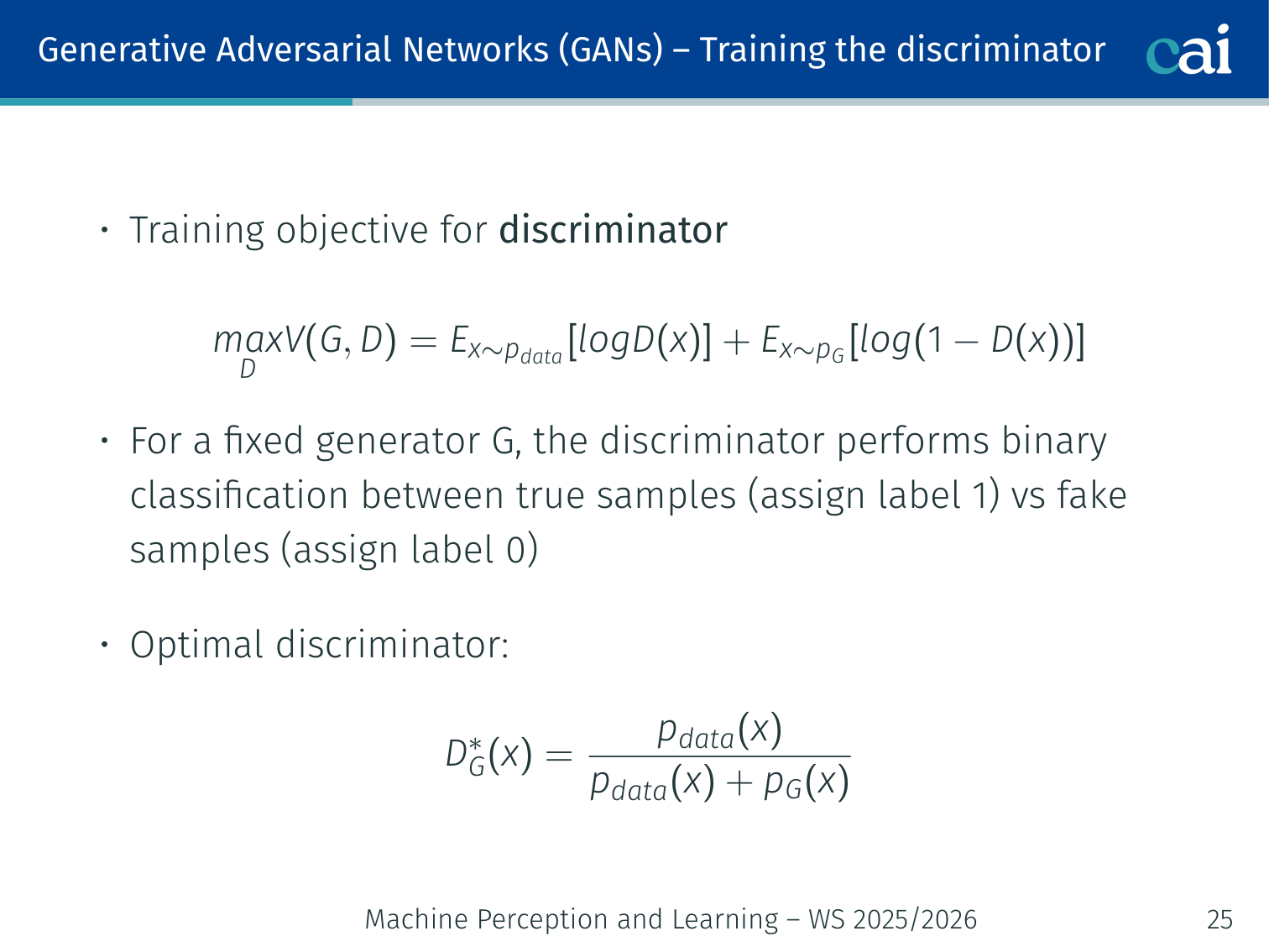 This is a standard binary cross-entropy loss. For a fixed generator , the optimal discriminator is: