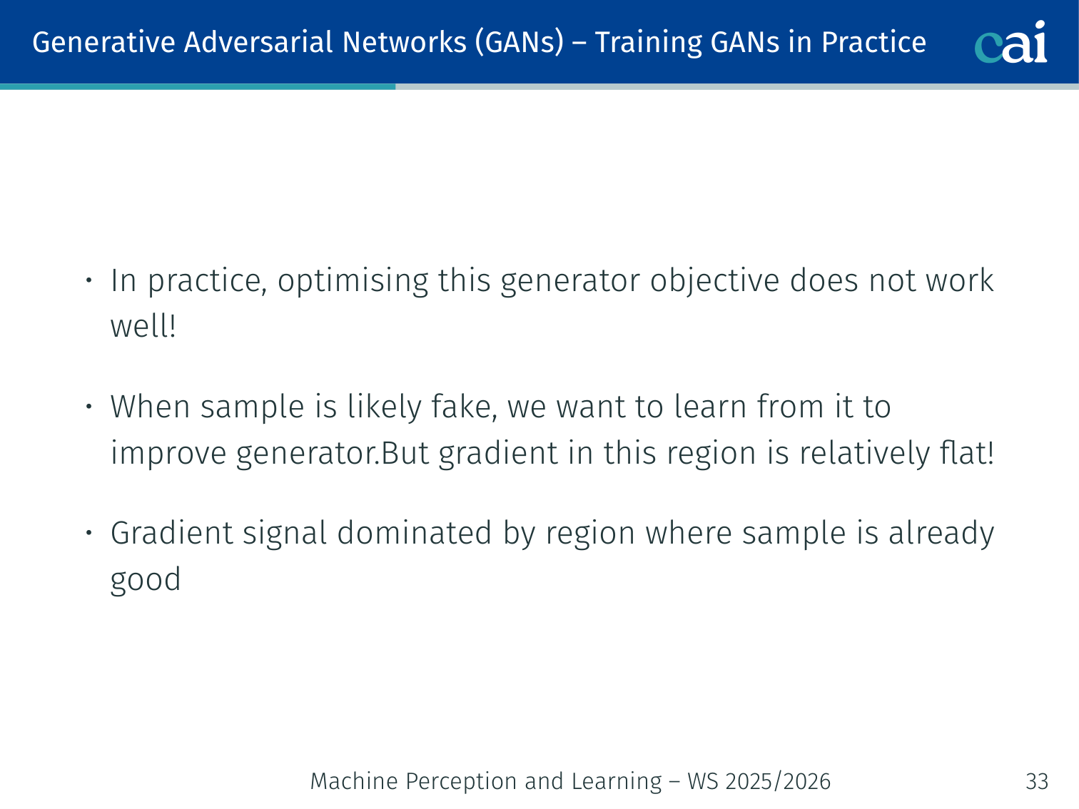 - The gradient in this region is flat — the generator receives almost no learning signal exactly when it needs it most.