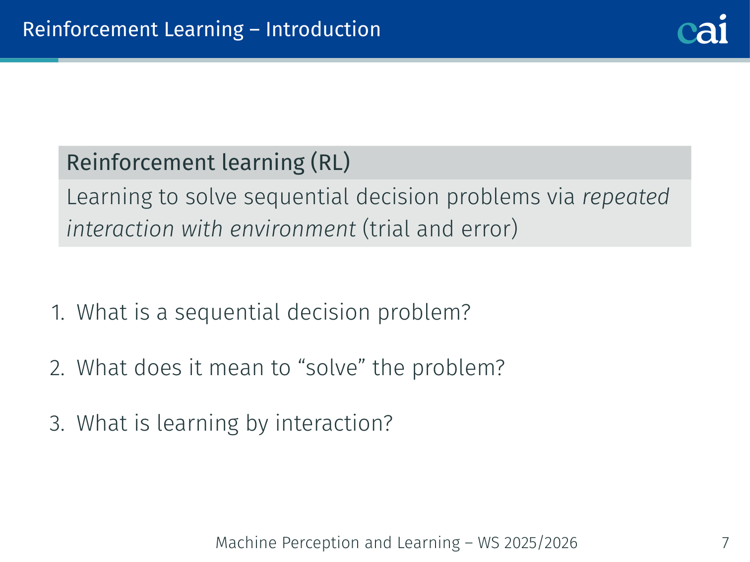Reinforcement learning is learning to solve sequential decision problems via repeated interaction with an environment (trial and error).