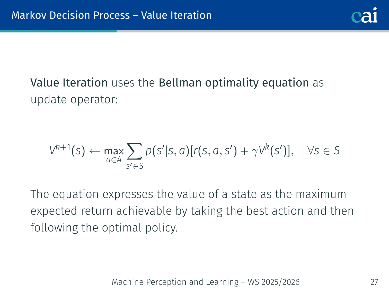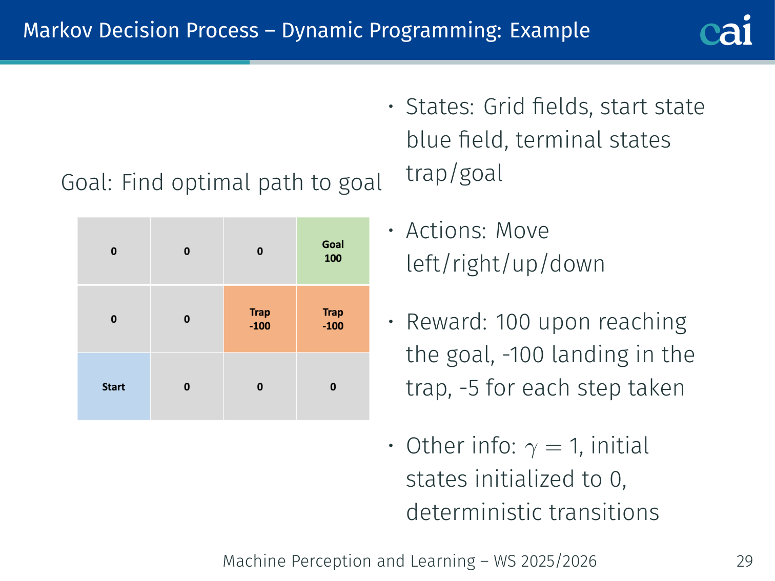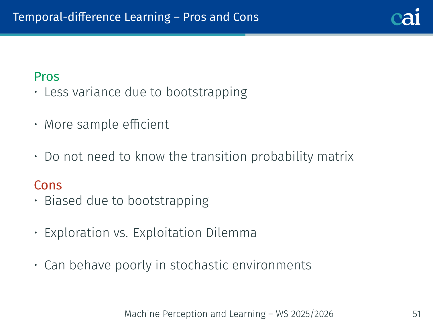- Bellman Equation: Decomposes the value of a state into the immediate reward plus the discounted value of the next state.
