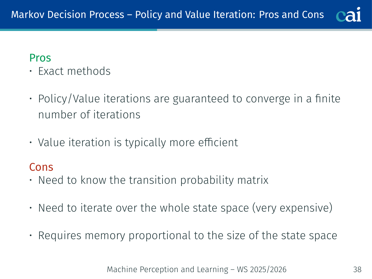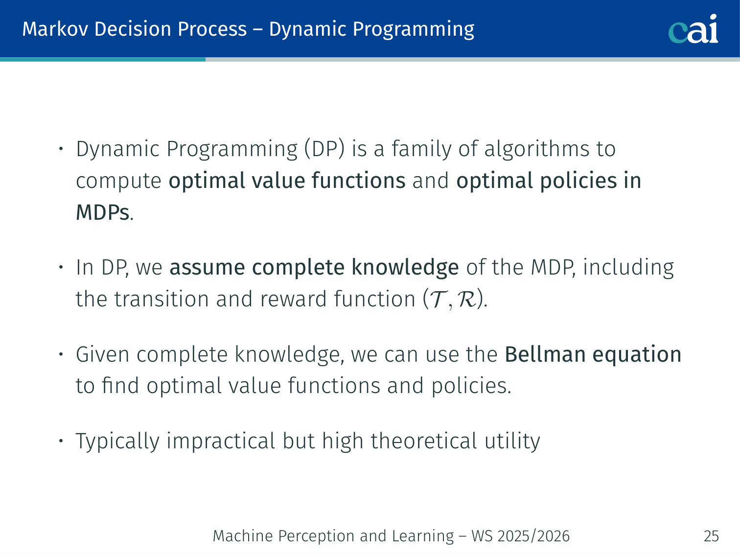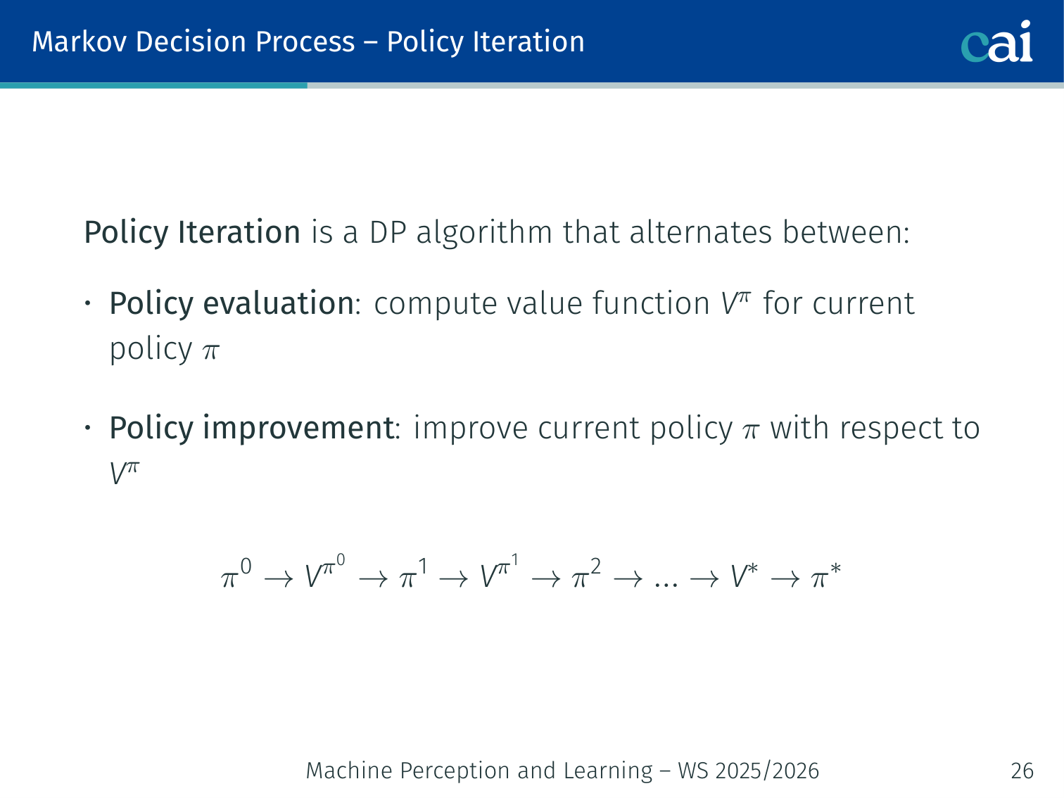 - Bellman Equation: Decomposes the value of a state into the immediate reward plus the discounted value of the next state.