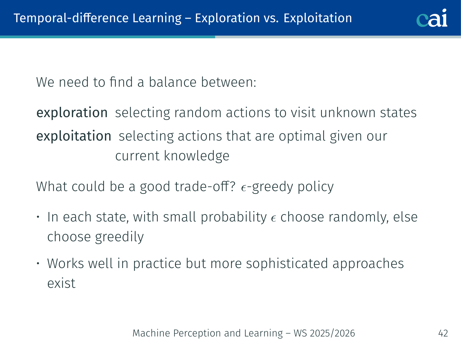 - Exploration vs. Exploitation: The agent must balance trying new actions (-greedy) with using what it already knows to get high rewards.