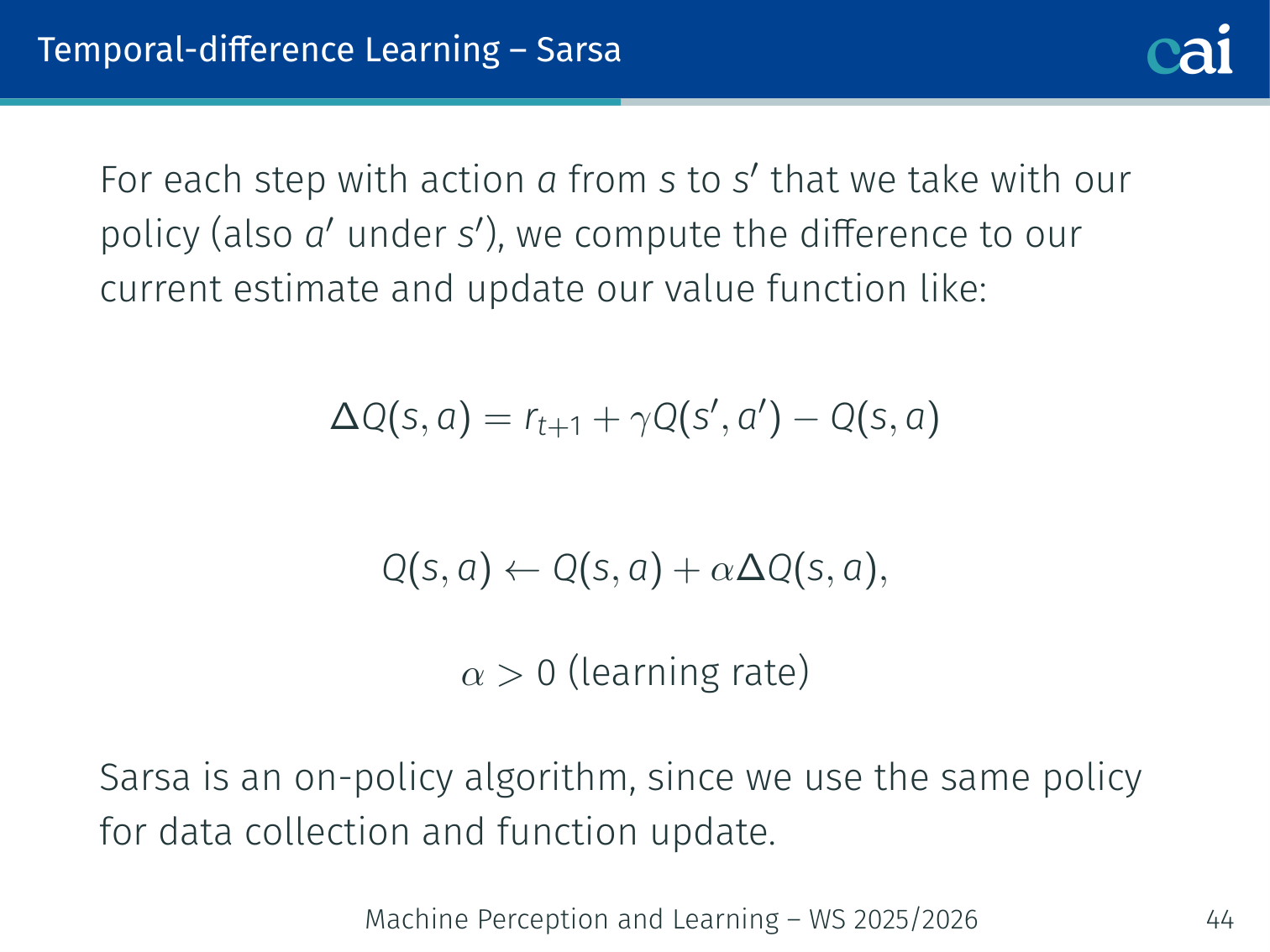 | SARSA | TD, on-policy | Q updates using actual next action from same policy |
