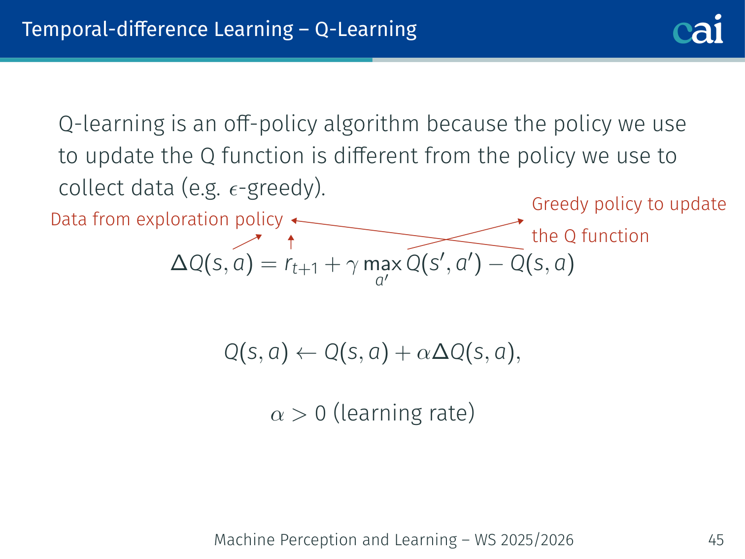 - Q-Learning: An Off-policy algorithm that learns the optimal action-value function regardless of the agent’s current behavior.