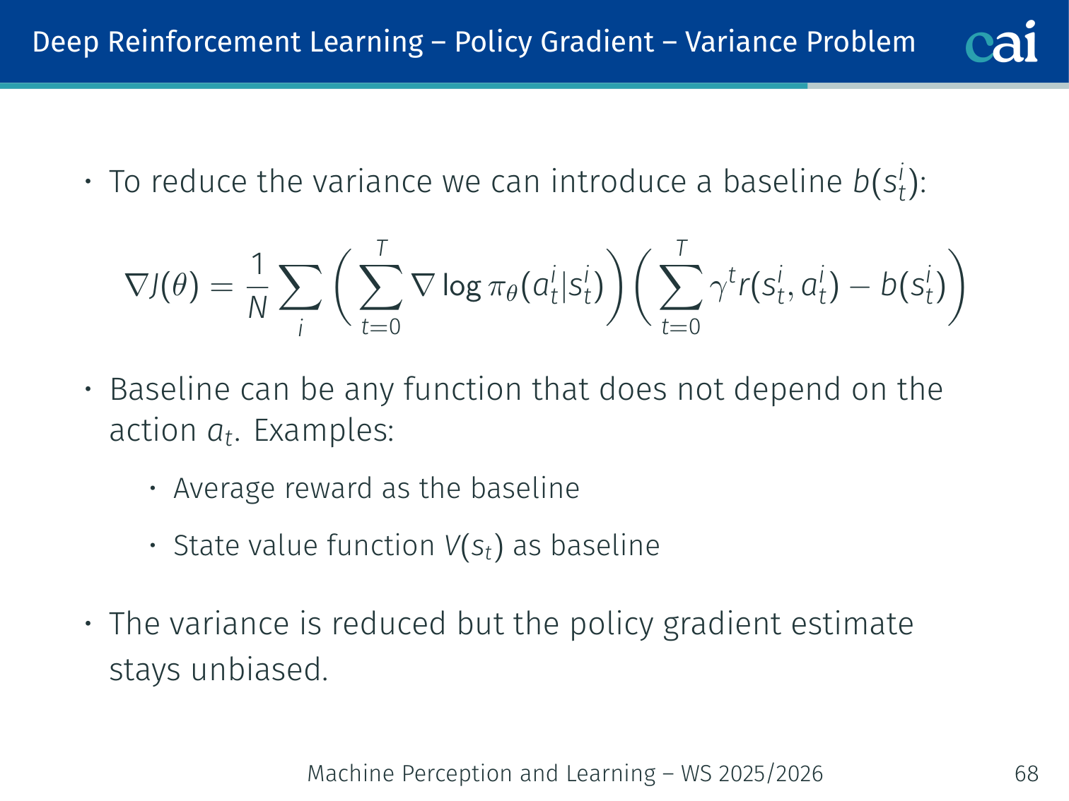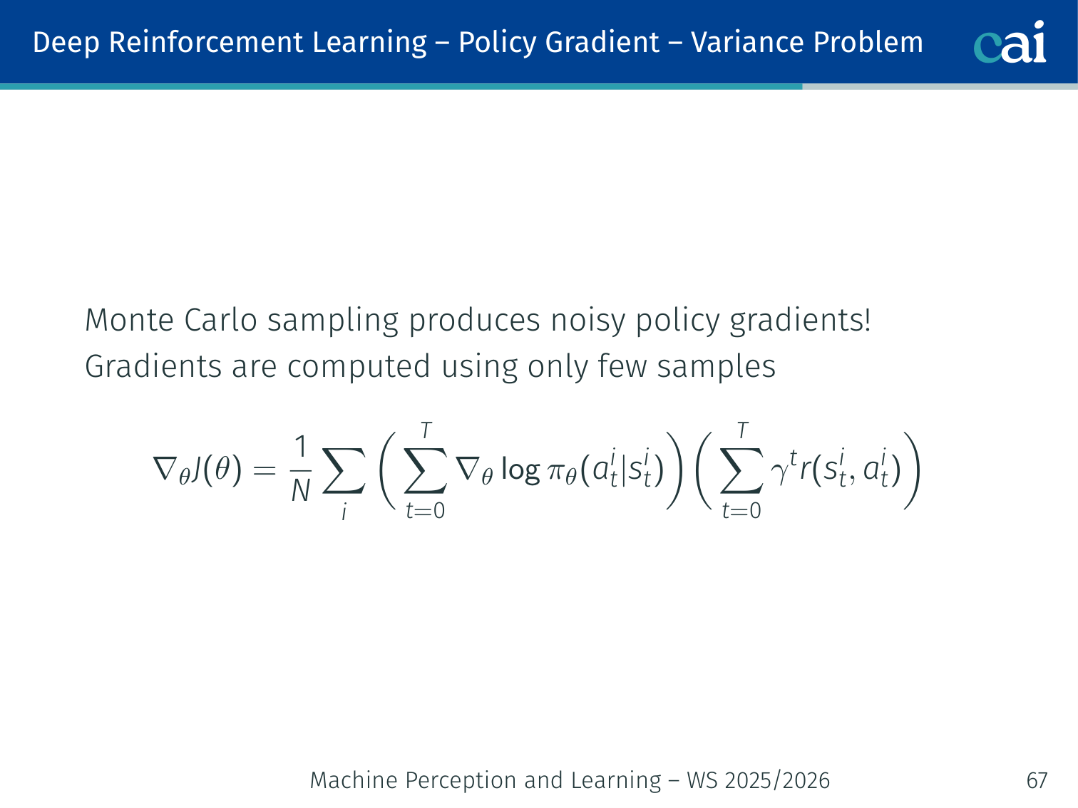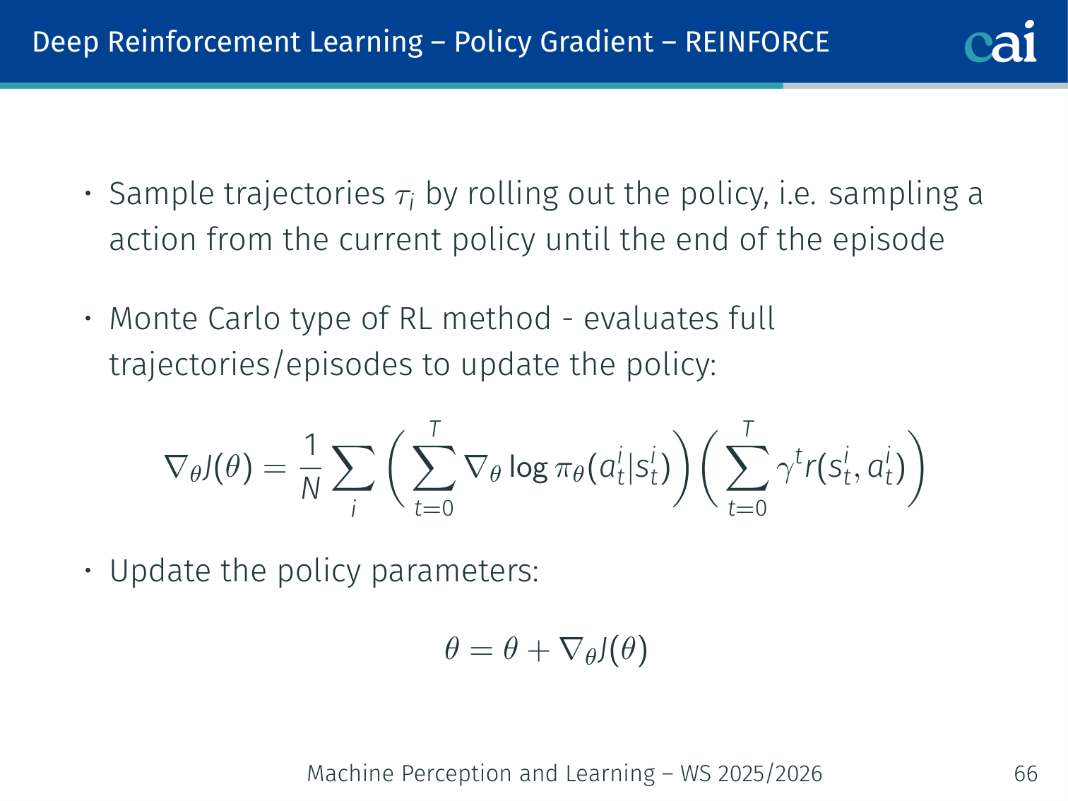 | REINFORCE | Policy gradient (MC) | Full trajectory rollouts; high variance |