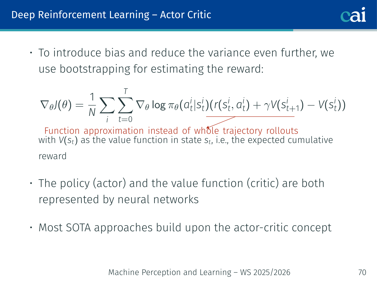 - The Actor-Critic Split: The Actor focuses on behavior (what to do), while the Critic focuses on judgment (how good the current state is).