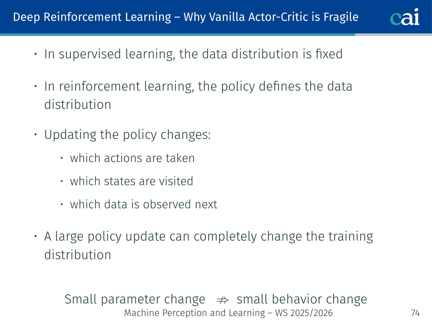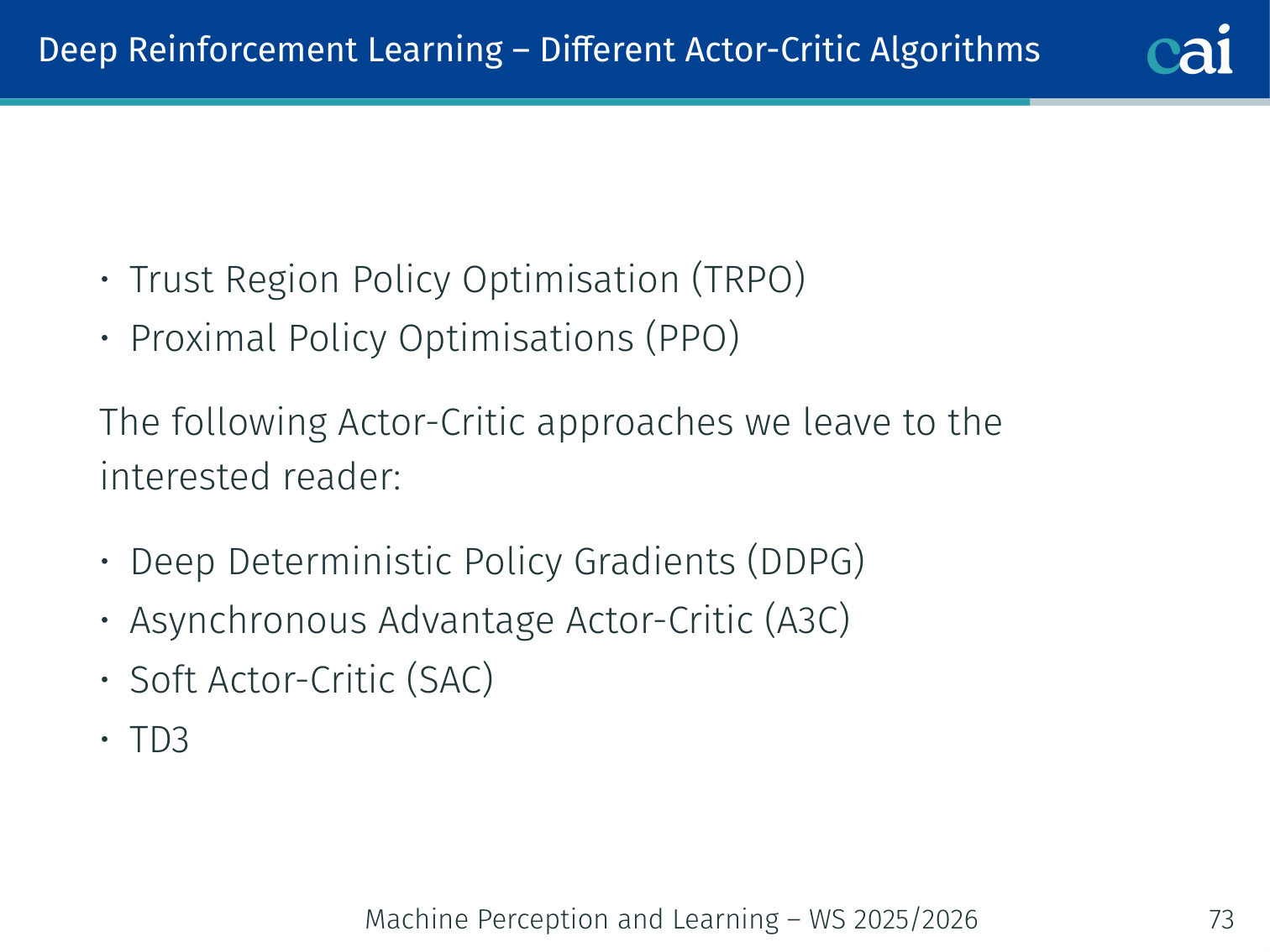 - Many RL algorithms differ mainly in how they trade off exploration, stability, variance, and sample efficiency.