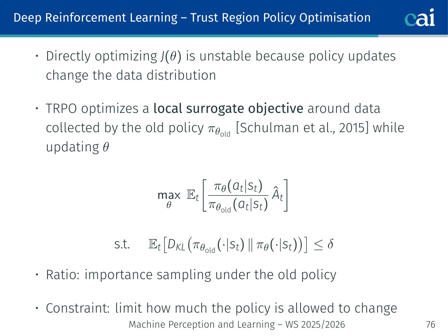 | TRPO | Actor-Critic | Hard KL trust region; second-order optimisation |