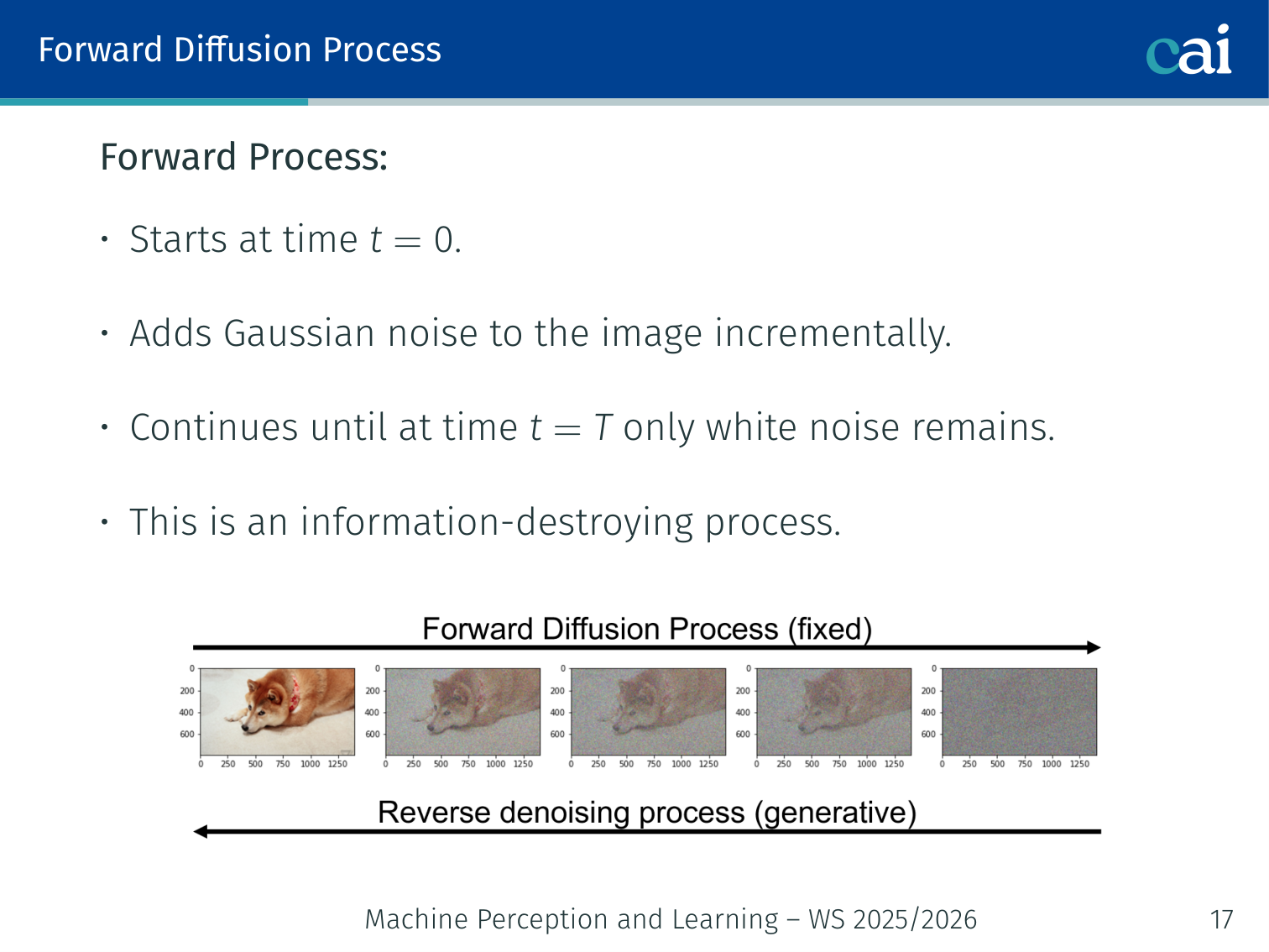 Example: Start with a photo of a dog. After T=1000 Gaussian noise steps, the image becomes indistinguishable from random Gaussian noise. A neural network trained to reverse this process can then go from noise back to a realistic dog photo.