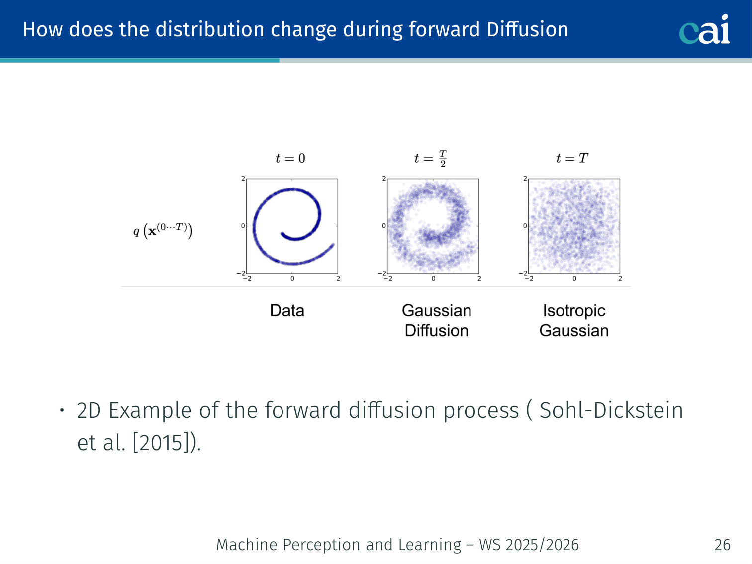 - In 2D (Sohl-Dickstein et al., 2015): a non-Gaussian data distribution smoothly becomes a Gaussian blob after many steps.