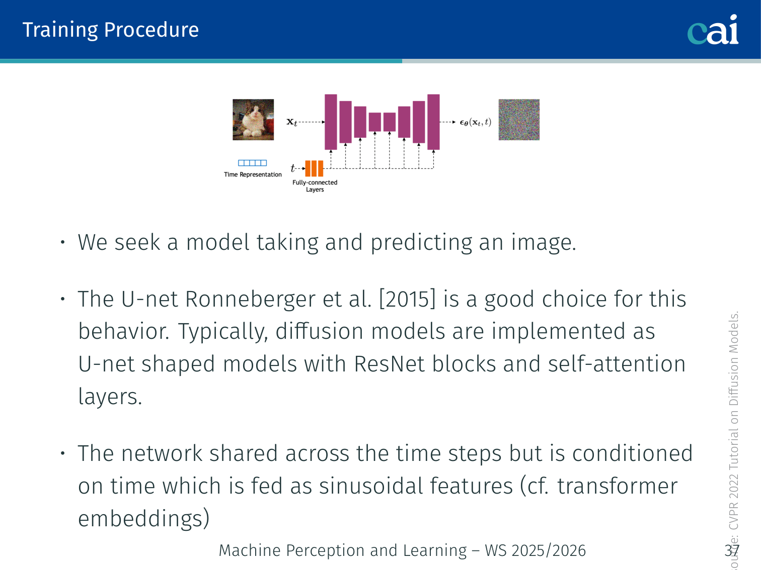 alpha_bartrick, we don’t have to simulate 1000 steps of noise to train the model. We can pick anytand calculatex_tdirectly. - Predicting the Noise: Interestingly, it is easier for the network to predict the noise than to predict the clean image directly.