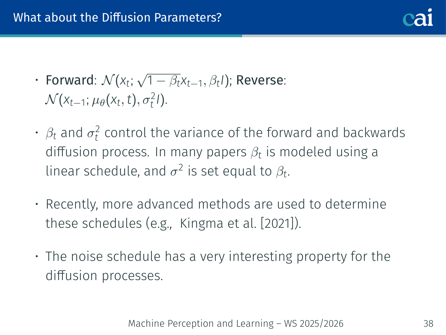 | Noise schedule | (linear or cosine) controls how fast structure is destroyed |