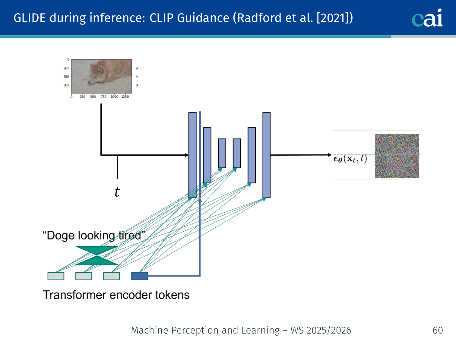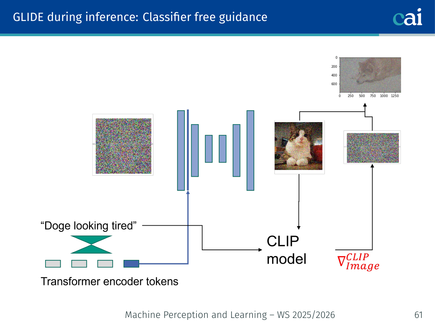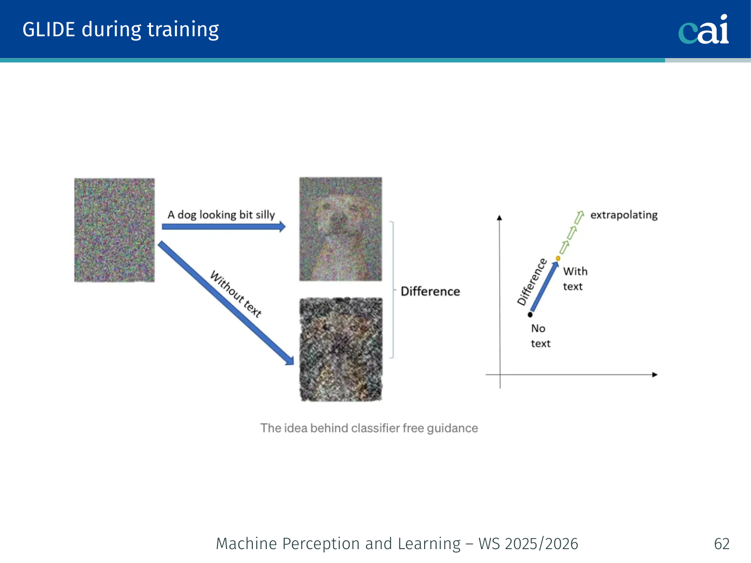The lecture’s training slide clarifies how classifier-free guidance is enabled: during training, GLIDE is randomly asked to denoise with text conditioning and without text conditioning. That means the same network learns both: